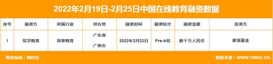 2月第四周(2.19-2.25),在线教育领域又有哪些事?行业动态方面,网易有道、高途发布季度财报,字节跳动四大教育业务停运,流利说宣布计划变更ADS比率,腾讯退出爱作业公司股东。以下为网经社教育台(EDU..CN)带来本周在线教育领域最新动态回顾。一、融资事件据网经社旗下电商大数据库“电数宝”(DATA..CN)监测数据显示,本周融资1起,统招专升本考试教育培训品牌“筑学教育...