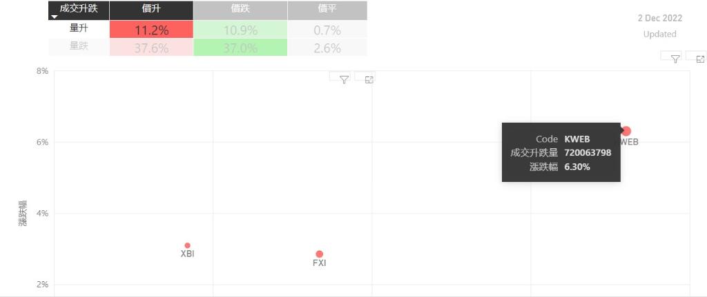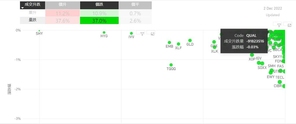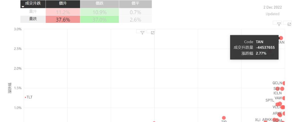 在12月2日的美股主要300只ETF交易品种中,录得有49%的ETF交易品种的ETF价格上升;尽管录得不过半数的ETF价格录得上升,不过仍有38%的ETF产品,虽然价格上升,成交额却下跌。在价升量跌的ETF当中,其中TAN升幅最大,录得2.77%升幅;其次为$中国ETF-iSharesMSCI(NASDAQMCHI)$,录得2.44%。QCLN录得1.62%的升幅,属於价升量跌的ETF当中,排名...