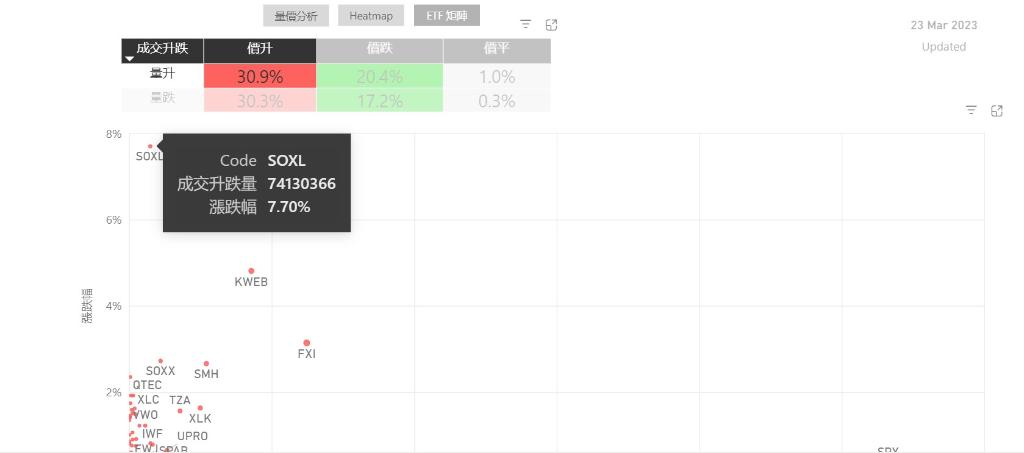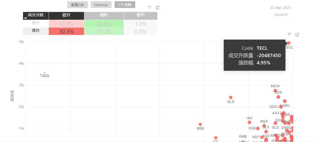 在3月23日的美股主要300只ETF交易品种中,录得有61%的ETF交易品种的ETF价格上升;尽管录得过半数的ETF价格录得上升,不过仍有30%的ETF产品,虽然价格上升,成交额却下跌。在价升量跌的ETF当中,其中TECL升幅最大,录得4.95%升幅;其次为$中国ETF-iSharesMSCI(NASDAQ|MCHI)$,录得2.74%。GDX录得2.45%的升幅,属於价升量跌的ETF当中,排名...