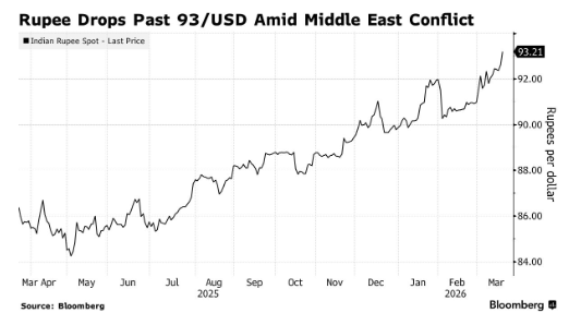 随着中东冲突持续升级的风险引发市场对印度经常账户赤字扩大的担忧,印度卢比兑美元汇率跌破93关口,刷新历史低位。随着中东冲突持续升级的风险引发市场对印度经常账户赤字扩大的担忧,印度卢比兑美元汇率跌破93关口,刷新历史低位。 在周四公共假期休市后恢复交易,卢比跟随区域内其他货币走弱,盘中一度下跌0.7%,至1美元兑93.28卢比。交易员表示,印度央行周五已入市干预,以支撑本币汇率。 中东部分核心能源设...