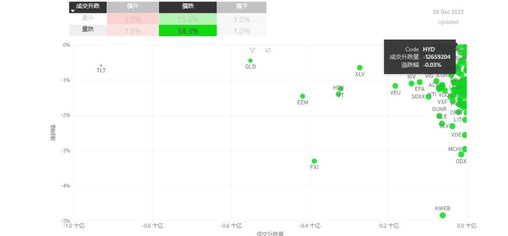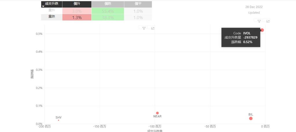 在12月28日的美股主要300只ETF交易品种中,录得有4%的ETF交易品种的ETF价格上升;尽管录得少数的ETF价格录得上升,不过仍有1%的ETF产品,虽然价格上升,成交额却下跌。在价升量跌的ETF当中,其中IVOL升幅最大,录得0.52%升幅;其次为$iSharesShortMaturityBondETF(AMEXNEAR)$,录得0.06%。BIL录得0.03%的升幅,属於价升量跌的...