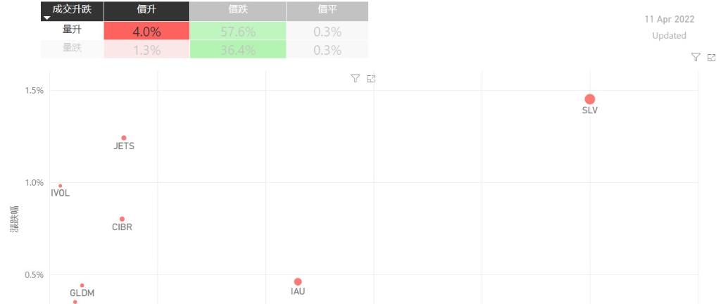 在4月11日的美股主要300只ETF交易品种中,有5%的ETF交易品种的ETF价格上升;尽管只有少数的ETF价格录得上升,不过仍有1%的ETF产品,虽然价格上升,成交额却下跌。在价升量跌的ETF当中,GLD升幅最大,录得0.50%升幅;其次为KBE,录得0.28%。FTSM录得0.02%的升幅,属於价升量跌的ETF当中,排名第三。如果考虑部署短期追升ETF,可以考虑以下品种,比如SLV、JET...