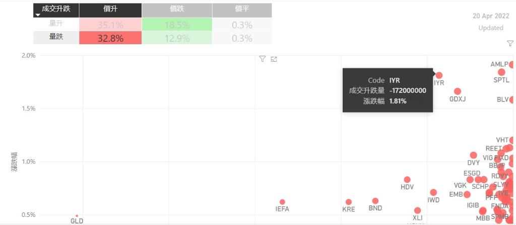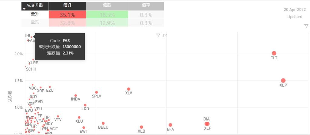 在4月20日的美股主要300只ETF交易品种中,有68%的ETF交易品种的ETF价格上升;尽管过半数的ETF价格录得上升,不过仍有33%的ETF产品,虽然价格上升,成交额却下跌。在价升量跌的ETF当中,AMLP升幅最大,录得1.91%升幅;其次为SPTL,录得1.84%。IYR录得1.81%的升幅,属於价升量跌的ETF当中,排名第三。如果考虑部署短期追升ETF,可以考虑以下品种,比如FAS、I...
