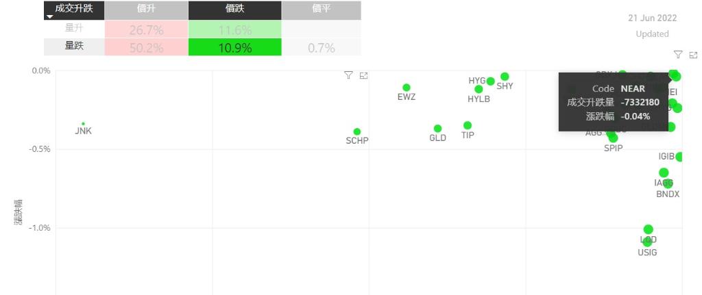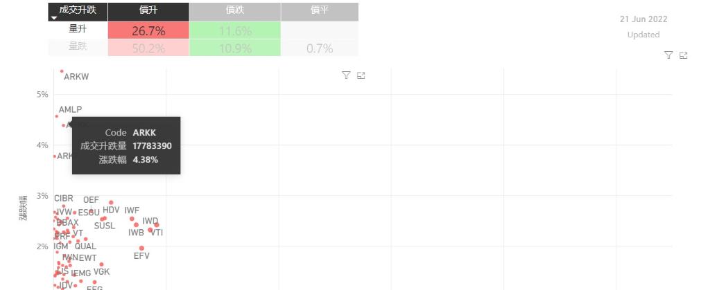 在6月21日的美股主要300只ETF交易品种中,录得有77%的ETF交易品种的ETF价格上升;尽管录得过半数的ETF价格录得上升,不过仍有50%的ETF产品,虽然价格上升,成交额却下跌。在价升量跌的ETF当中,SOXL升幅最大,录得8.03%升幅;其次为UPRO,录得7.58%。TECL录得7.54%的升幅,属於价升量跌的ETF当中,排名第三。如果考虑部署短期追升ETF,可以考虑以下品种,比如...