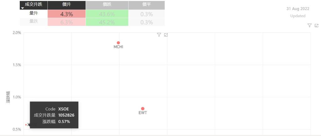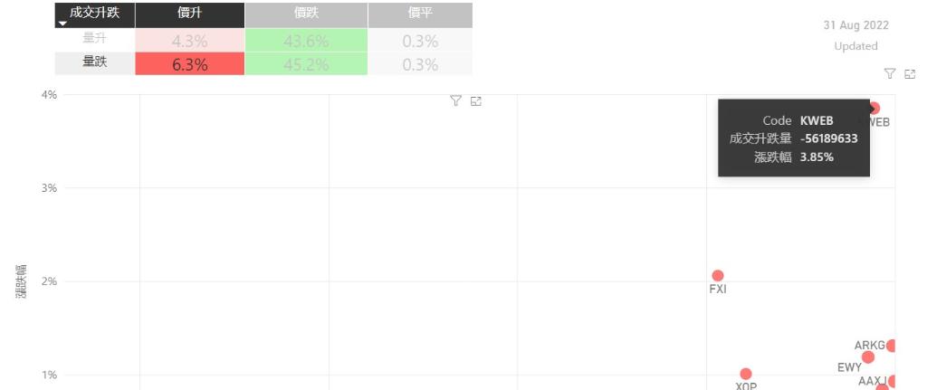 在8月31日的美股主要300只ETF交易品种中,录得有11%的ETF交易品种的ETF价格上升;尽管录得过半数的ETF价格录得上升,不过仍有6%的ETF产品,虽然价格上升,成交额却下跌。在价升量跌的ETF当中,KWEB升幅最大,录得3.85%升幅;其次为FXI,录得2.06%。ARKG录得1.31%的升幅,属於价升量跌的ETF当中,排名第三。如果考虑部署短期追升ETF,可以考虑以下品种,比如MC...