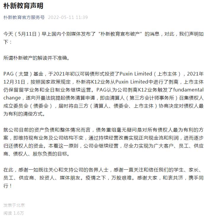 雷递网乐天5月11日报道朴新教育今日就“朴新教育宣布破产”传闻做出回应,称所谓朴新破产的解读并不准确。朴新教育指出,PAG(太盟)基金,于2021年初以可转债形式投资了PuxinLimited(上市主体),2021年12月31日,按照国家政策规定,朴新将K12业务从PuxinLimited中进行了剥离,上市主体仍保留留学业务和全日制业务继续运营。PAG认为公司剥离K12业务触发了fund...