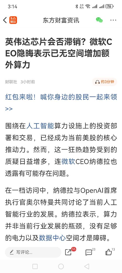 资讯 英伟达芯片会否滞销?微软CEO隐晦表示已无空间增加额外算力
