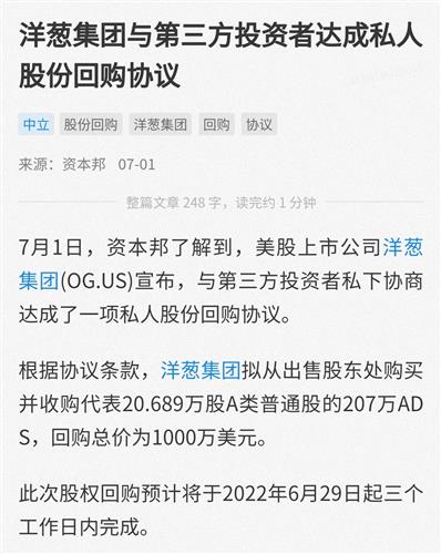 $洋葱(NYSE|OG)$洋葱集团与第三方投资者达成私人股份回购协议