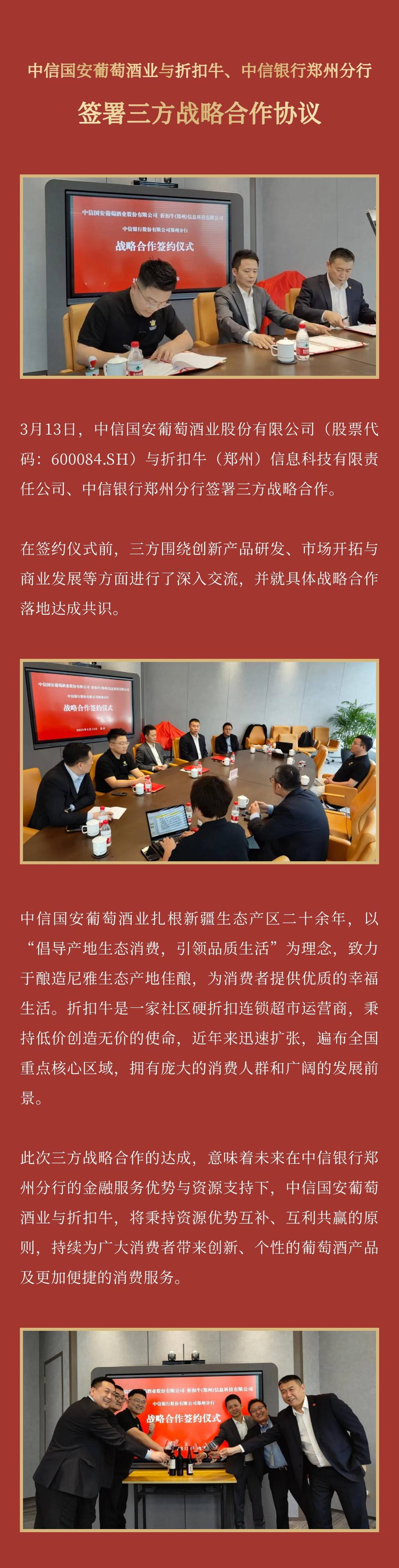600084中葡萄股份与折扣牛、中信银行郑州分行签署三方合作协议