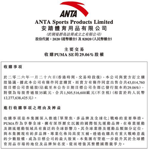 1月27日,安踏集团宣布,与Pinault家族的投资公司GroupeArtmis达成购股协议,收购全球标志性运动品牌彪马(PUMA)所属公司PUMASE29.06%的股权。现金对价为15亿欧元。 该次交易预计有望于2026年底前完成,但仍需要得到相关监管部门批准及满足惯例交割条件。此次股权收购资金全部来源于安踏集团的内部自有现金储备。 安踏集团董事局主席丁世忠表示:“收购彪马的股权成为最大股东,是...