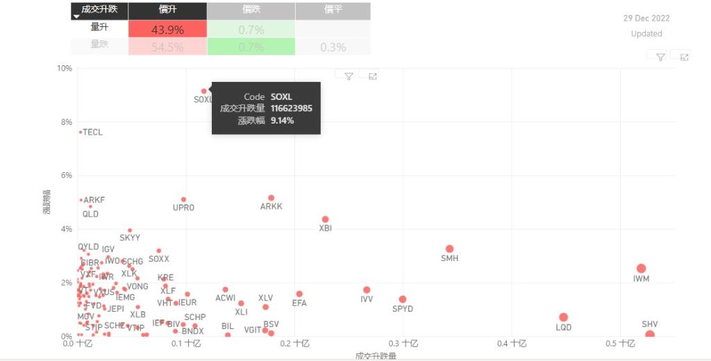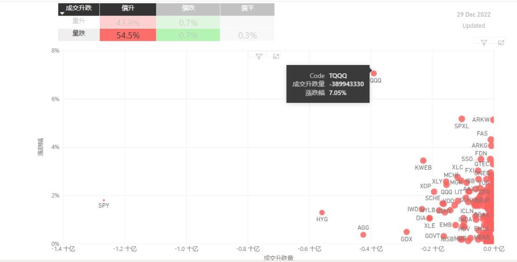 在12月29日的美股主要300只ETF交易品种中,录得有98%的ETF交易品种的ETF价格上升;尽管录得过半数的ETF价格录得上升,不过仍有55%的ETF产品,虽然价格上升,成交额却下跌。在价升量跌的ETF当中,其中TQQQ升幅最大,录得7.05%升幅;其次为$DirexionDailyS&P500Bull3X(AMEXSPXL)$,录得5.17%。ARKW录得5.13%的升幅,属於价升...