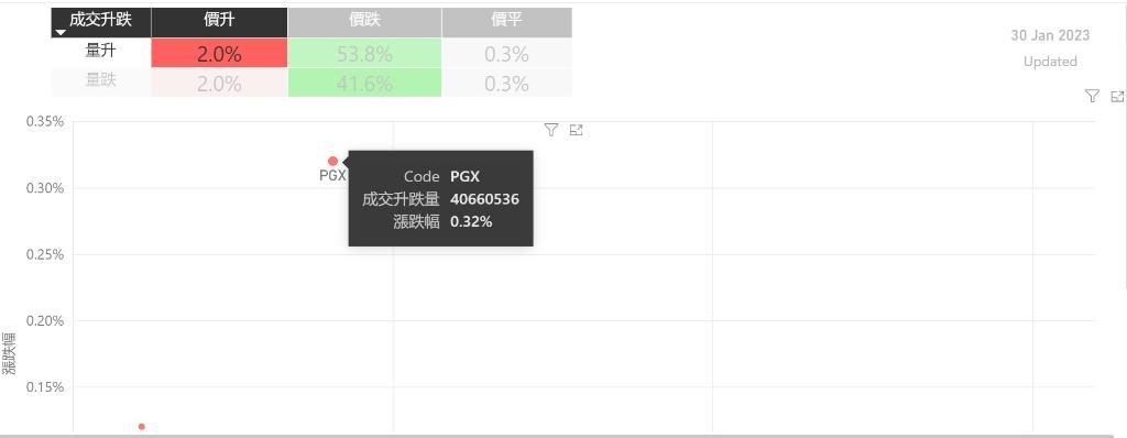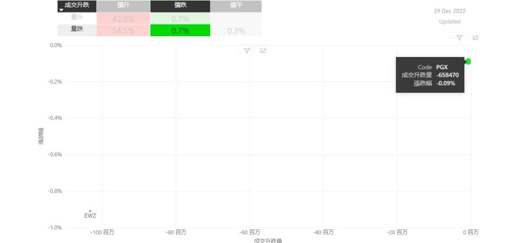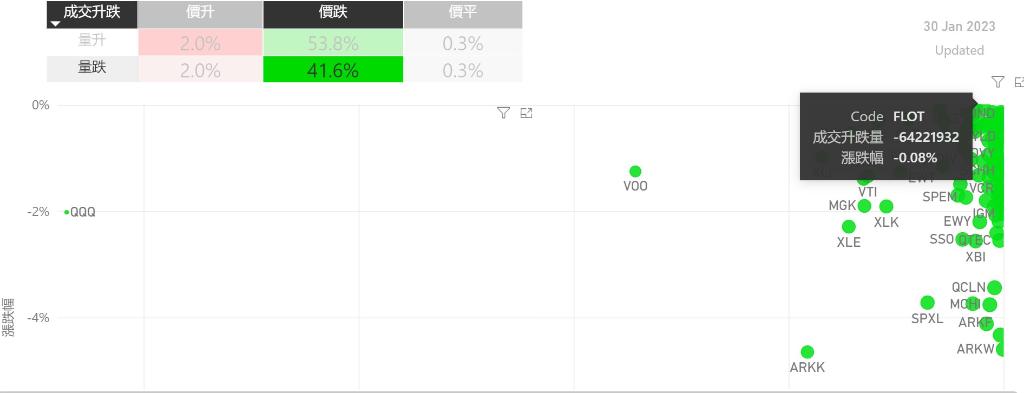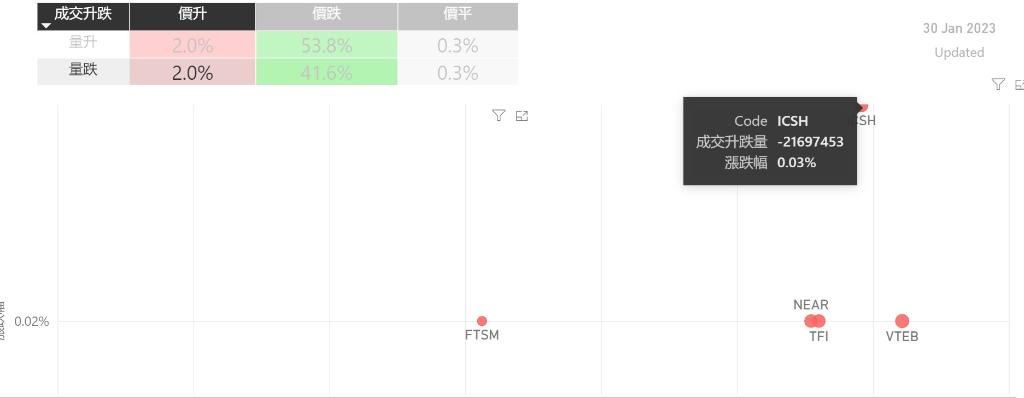在1月30日的美股主要300只ETF交易品种中,录得有4%的ETF交易品种的ETF价格上升;尽管录得只有少数的ETF价格录得上升,不过仍有2%的ETF产品,虽然价格上升,成交额却下跌。在价升量跌的ETF当中,ICSH升幅最大,录得0.03%升幅;其次为$FirstTrustEnhancedShortMatu(NASDAQ|FTSM)$,录得0.02%。NEAR录得0.02%的升幅,属於价升...
