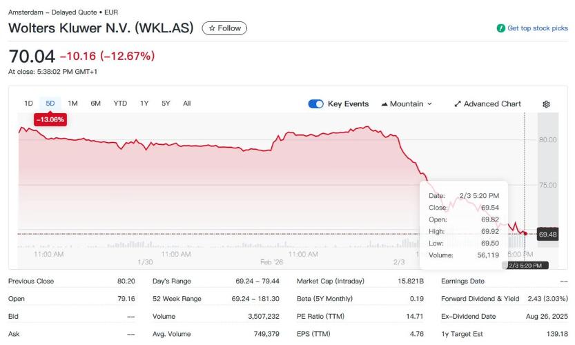 Anthropic推出一款面向企业内部法务团队的工具,实现合同审查、保密协议分流处理等多项自动化,引发欧美法律软件和出版公司股价大跌,荷兰威科集团(WoltersKluwer)一度重挫13%,英国励讯集团(RELX)跌14%。 周三亚洲软件股也面临抛压,澳股Xero一度跌15%,创2021年5月最大,日股OBIC跌6%。