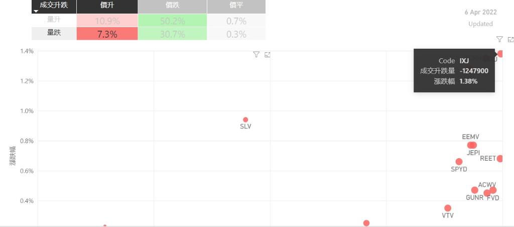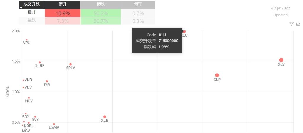 在4月6日的美股主要300只ETF交易品种中,有18%的ETF交易品种的ETF价格上升;尽管只有少数ETF价格录得上升,不过仍有7%的ETF产品,虽然价格上升,成交额却下跌。在价升量跌的ETF当中,IXJ升幅最大,录得1.38%升幅;其次为SCHH,录得1.35%。VHT录得1.28%的升幅,属於价升量跌的ETF当中,排名第三。如果考虑部署短期追升ETF,可以考虑以下品种,比如XLU、VPU以...