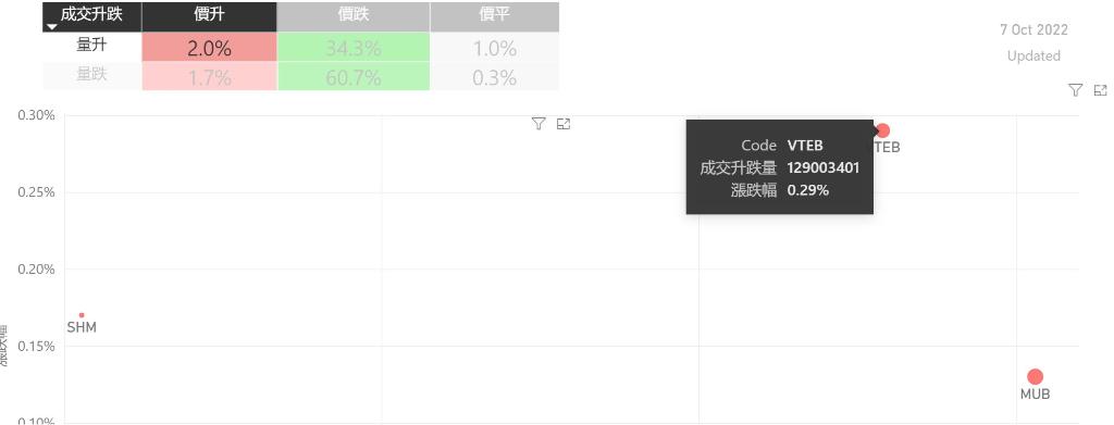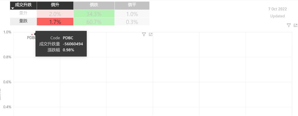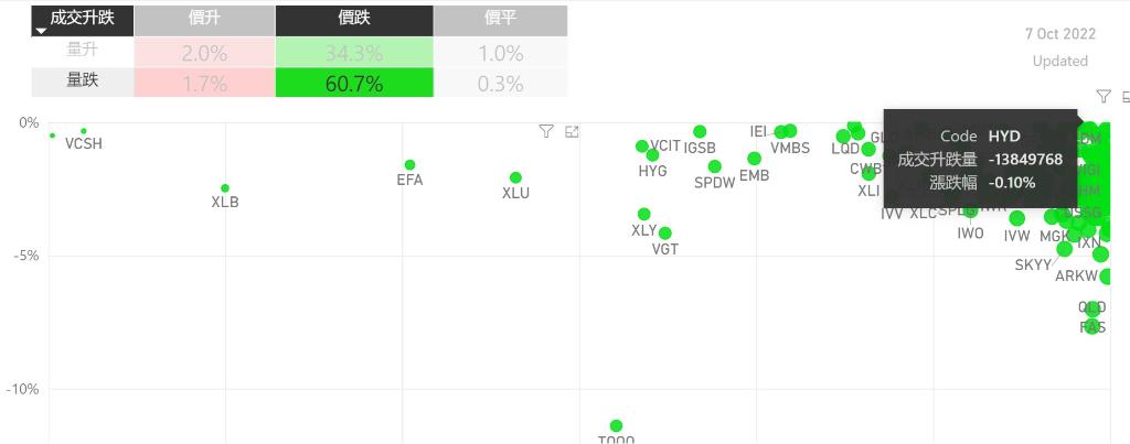 在10月7日的美股主要300只ETF交易品种中,只录得有4%的ETF交易品种的ETF价格上升;尽管录得只有少数的ETF价格录得上升,不过仍有2%的ETF产品,虽然价格上升,成交额却下跌。在价升量跌的ETF当中,PDBC升幅最大,录得0.98%升幅;其次为SCHP,录得0.08%。FLOT录得0.02%的升幅,属於价升量跌的ETF当中,排名第三。如果考虑部署短期追升ETF,可以考虑以下品种,比如...