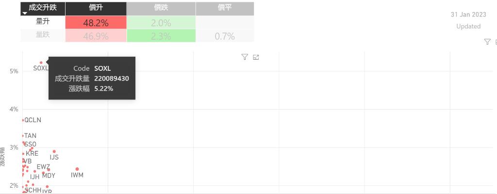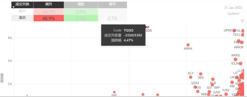 在1月31日的美股主要300只ETF交易品种中,录得有95%的ETF交易品种的ETF价格上升;尽管录得超过半数的ETF价格录得上升,不过仍有47%的ETF产品,虽然价格上升,成交额却下跌。在价升量跌的ETF当中,$三倍做多纳斯达克100ETF(NASDAQ|TQQQ)$升幅最大,录得4.47%升幅;其次为UPRO,录得4.31%。SPXL录得4.30%的升幅,属於价升量跌的ETF当中,排名第三。...