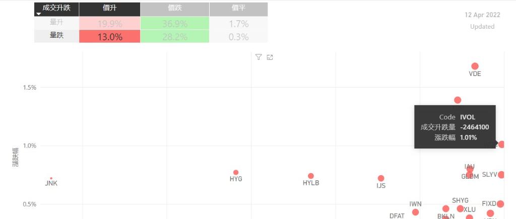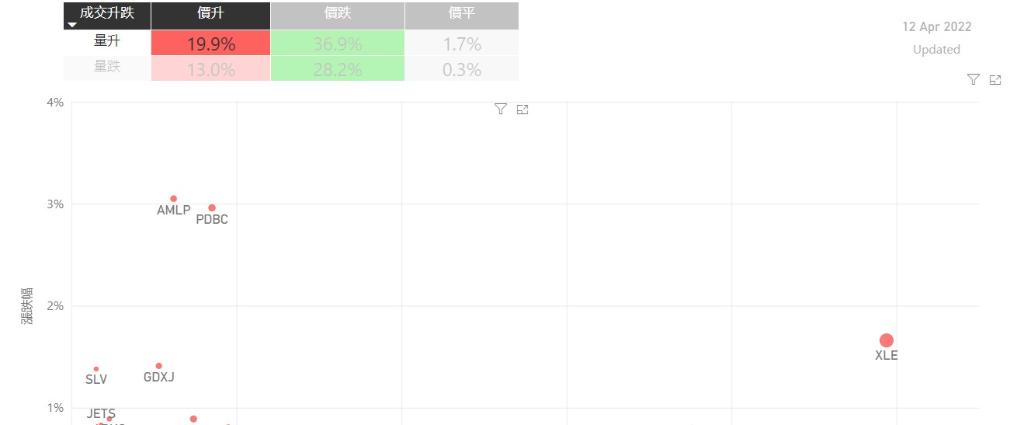 在4月12日的美股主要300只ETF交易品种中,有33%的ETF交易品种的ETF价格上升;尽管只有不过半数的ETF价格录得上升,不过仍有13%的ETF产品,虽然价格上升,成交额却下跌。在价升量跌的ETF当中,VDE升幅最大,录得1.68%升幅;其次为XOP,录得1.39%。IVOL录得1.01%的升幅,属於价升量跌的ETF当中,排名第三。如果考虑部署短期追升ETF,可以考虑以下品种,比如AML...