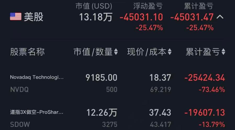 $三倍做空道指ETF-ProShares(AMEX|SDOW)$本金18.6万美金,拿了一年2倍做空英伟达亏了2.5万美金,3倍做空道琼斯亏了1.9万。大家说美股会崩盘吗?偏偏反着来,拿10年绝不松手!
