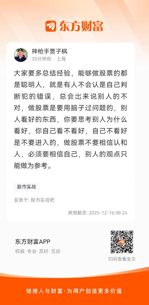 大家要多总结经验,能够做股票的都是聪明人,就是有人不会认是自己判断犯的错误,总会岀来说别人的不对,做股票是要用脑子过问题的,别人看好的东西,你要思考别人为什么看好,你自己看不看好,自己不看好是不要进入的,做股票不要相信认和人,必须要相信自己,别人的观点只能做为参考。