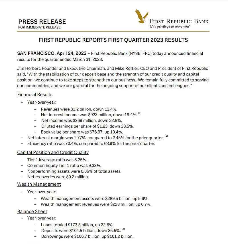第一共和银行赌财报的一众选手,现在财报靴子已落地。坏消息是存款流失千亿(不含300亿补贴),超预期。好消息也有。理财规模2895亿,增长了5.6%,让资本眼馋,怀璧其罪,也是是原罪之一阿。4月份至今流失了1%+的存款,考虑到季度性用户取款缴税,可以说是稳住失血局面了。还剩100亿现金流,7月份要还300亿,第一共和也表示要寻找替代的战略选择,说白了就是捡一些亏损少的债券资产抛售了把摩根它们的300...