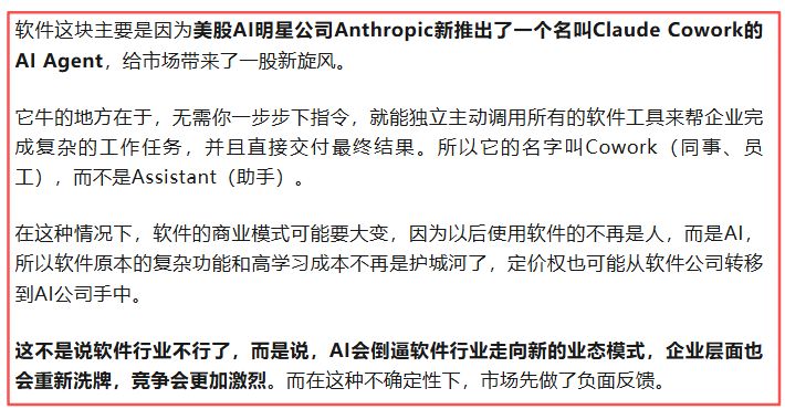 昨晚美股的软件股抛售潮,貌似有点走偏了,一夜之间迅速发酵成了所谓的“AI冲击论”,认为AI如今对软件行业的洗牌是个先兆,以后也会在其他科技行业重演。 于是这股情绪性冲击,很快从软件扩散到了半导体、AI等整个科技板块,费城半导体指数昨晚暴跌4.36%,导致全球资金的风险偏好骤降,并且通过美股中概,把这股寒气传导给了A股和港股。所以今天,咱们一起吃面吧。 由于半导体、光模块、太空光伏这几个核心板块跌得...
