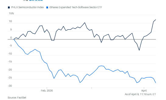 新一轮人工智能热潮正在推动芯片股升至历史新高,同时软件股下跌