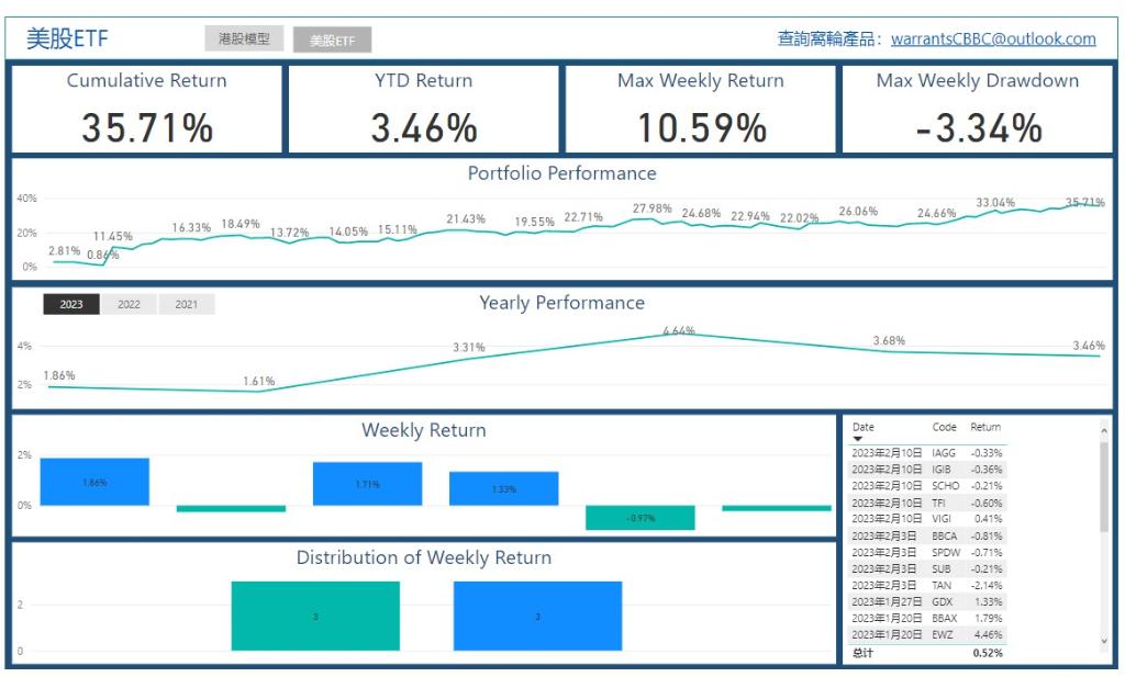 “ETF组合”基於大数据分析,每个星期选出4-5只ETF产品,以一个星期作为交易週期,设定星期一买入星期四卖出,并观察每週ETF产品的收益变化。每只ETF设定止损点为4%。从2022年1月25日至2023年2月20日整体累计收益:35.71%2023年初至今的年度收益:+3.46%最佳周收益:10.59%备註:以上资料来源於【ETF策略】PBI在线文档以下是2023年2月3日的【ETF策略...