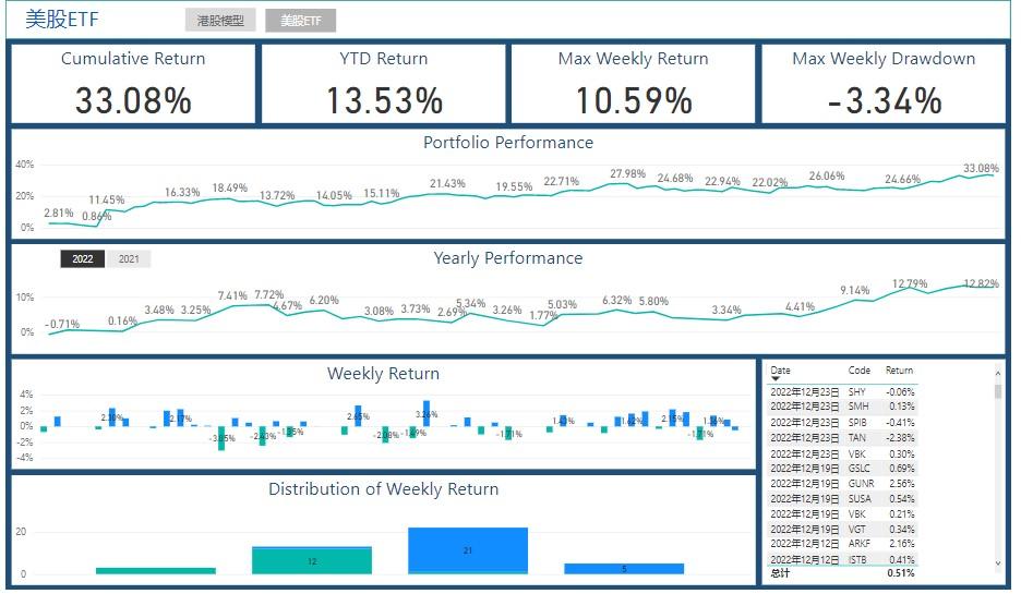 “ETF组合”基於大数据分析,每个星期选出4-5只ETF产品,以一个星期作为交易週期,设定星期一买入星期四卖出,并观察每週ETF产品的收益变化。每只ETF设定止损点为4%。从2021年1月25日至2023年1月3日整体累计收益:33.08%2022年初至今的年度收益:+13.53%最佳周收益:10.59%备註:以上资料来源於【ETF策略】PBI在线文档以下是2022年12月27日的【ETF策略...
