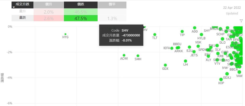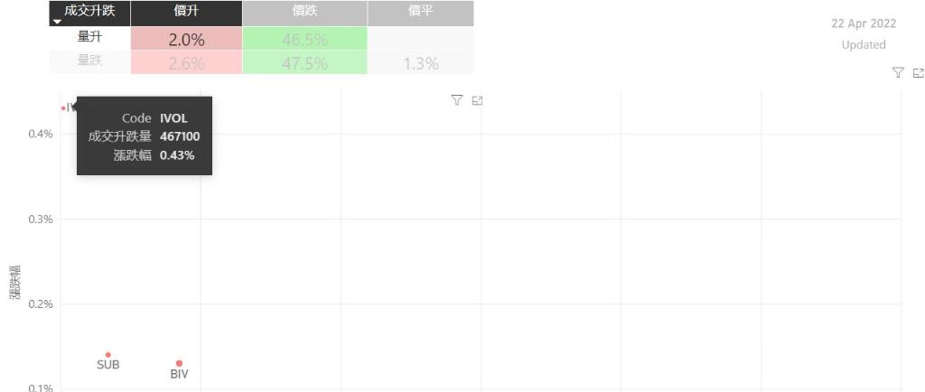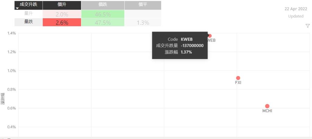 在4月22日的美股主要300只ETF交易品种中,有4.6%的ETF交易品种的ETF价格上升;尽管只有4.6%价格录得上升,不过仍有2.6%的ETF产品,虽然价格上升,成交额却下跌。在价升量跌的ETF当中,KWEB升幅最大,录得1.37%升幅;其次为FXI,录得0.92%。MCHI录得0.62%的升幅,属於价升量跌的ETF当中,排名第三。如果考虑部署短期追升ETF,可以考虑以下品种,比如IVOL...