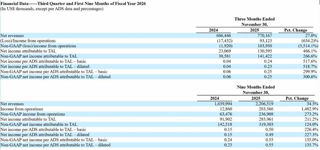 今年1月29日,好未来(TAL.US)披露了其截至去年11月30日的26Q3季度财报。今年1月29日,好未来(TAL.US)披露了其截至去年11月30日的26Q3季度财报。 财报显示,好未来当期实现净收入7.7亿美元,同比增长27%;另在26Q9期内,公司净收入累计22.07亿美元,同比增长34.57%;与此同时,公司盈利能力实现明显改善:当期经营利润为9312.3万美元,同比实现扭亏为盈,在此情...