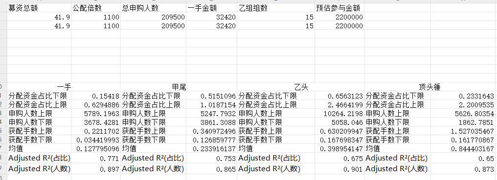 今天没有新股,捣鼓了一天的中签率。 之前发过一篇一手中签率的估算,今天用回归模型把甲尾乙头的中签率也捣鼓出来了。 根据模型预测,一手中签率在3.4%~12.8%,甲尾中签率在12.7%~34.1%,乙头中签率在16.8%~63%,顶头槌中签率在16%~152.7%。 如果中签率大于100%,意思就是稳中一手,比如152.7%的中签率,就是稳中1手,概率中2手。 这个模型今天下午刚做出来,可能还不完...
