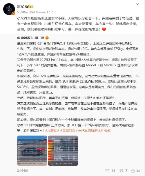 资讯 雷军回应小米SU7能耗评测弱于特斯拉