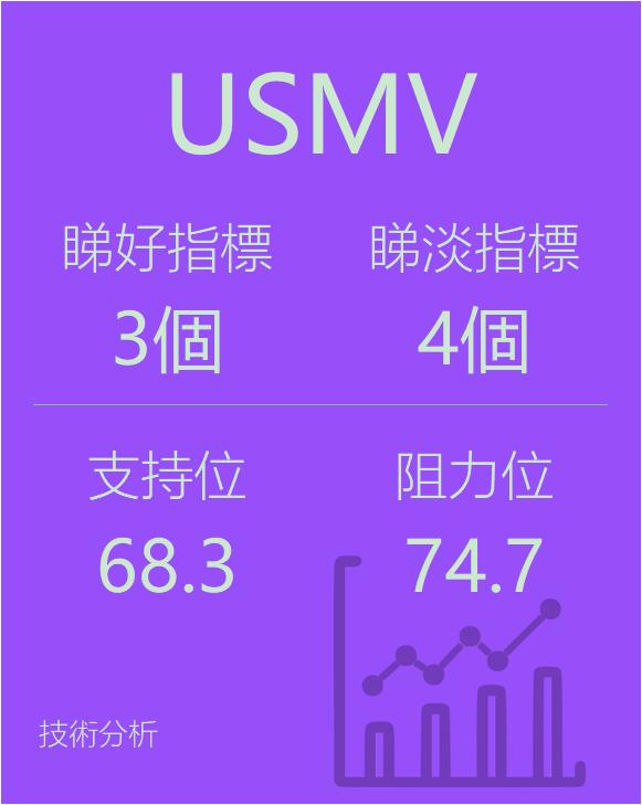 美股个股指标分析-$iSharesMSCIUSAMinVolFactorETF(USMV)$$美国最小波幅ETF-iShares(AMEXUSMV)$看好指标3个,看淡指标4个。支持位68.3,阻力74.7,仅供参考。