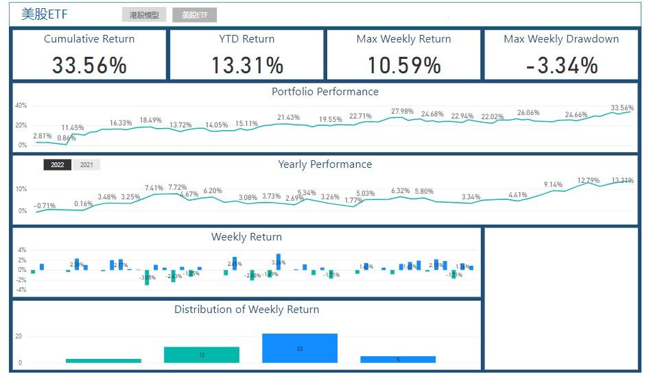 “ETF组合”基於大数据分析,每个星期选出4-5只ETF产品,以一个星期作为交易週期,设定星期一买入星期四卖出,并观察每週ETF产品的收益变化。每只ETF设定止损点为4%。从2021年1月25日至2022年12月28日整体累计收益:33.56%2022年初至今的年度收益:+13.31%最佳周收益:10.59%备註:以上资料来源於【ETF策略】PBI在线文档以下是2022年12月19日的【ETF...