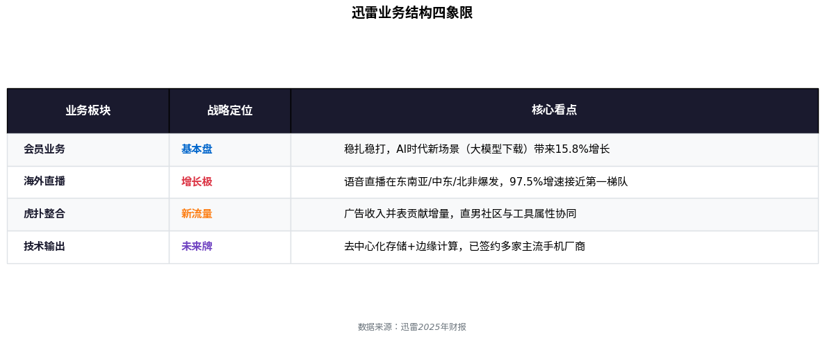 很多公司都在讲第二增长曲线,但真正做到的不多。迅雷的直播业务从起步到贡献近25%的收入,只用了短短两年时间,这个转化效率值得肯定。 分析其成功的原因,首先是产品协同。迅雷的核心用户是下载重度用户,这部分人群对娱乐内容的需求天然存在,直播只是满足了他们已有的需求。其次是技术复用。直播业务对传输技术的要求很高,这正是迅雷的强项,进入这个领域有天然的优势。最后是市场选择。避开国内直播红海,直接切入海外新...