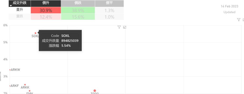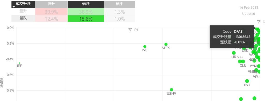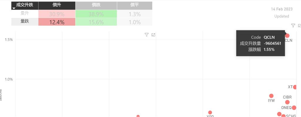 在2月14日的美股主要300只ETF交易品种中,录得有43%的ETF交易品种的ETF价格上升;尽管录得不过半数的ETF价格录得上升,不过仍有12%的ETF产品,虽然价格上升,成交额却下跌。在价升量跌的ETF当中,QCLN升幅最大,录得1.55%升幅;其次为$iSharesExponentialTechnologie(NASDAQ|XT)$,录得0.90%。IYW录得0.79%的升幅,属於价升量...