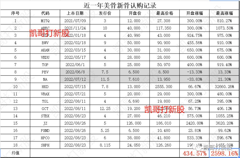 美骨打新胜率100%,开盘均值434%收益,最高涨幅均值2600%
