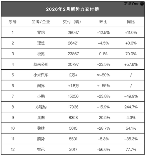 定焦One(dingjiaoone)原创 作者|金玙璠 编辑|魏佳 3月1日,新势力陆续公布2月交付量。 先看新势力六强的座次。零跑以28067辆,守住了新势力冠军的位置。理想紧随其后,交付26421辆,前两名相差不到2000辆,且理想环比降幅仅4.5%,是六强里跌得最少的;蔚来三个品牌合计20797辆,位列第三,主力还是蔚来ES8。 第四到第六名的差距则明显拉开:小米交付量2万+,排名第四。问界...