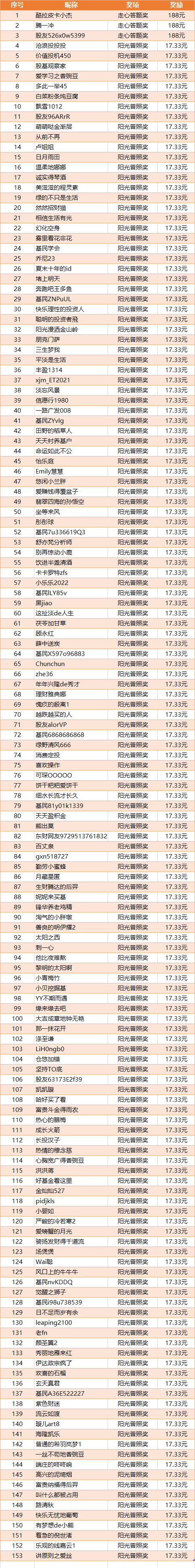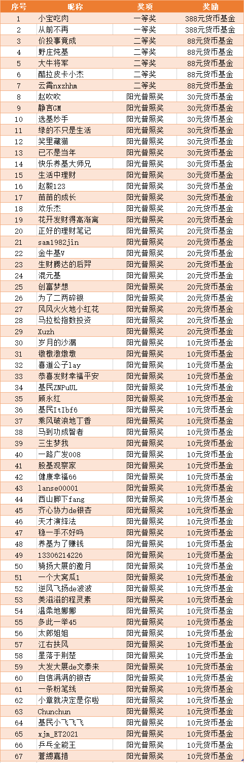 本次#我的养老金规划#有机会赢最高388元~活动,在们热情参与下,已圆满结束。为了回馈小伙伴们的热情,根据活动规则和标准评选出了以下获奖用户。活动详情:我的养老金规划有机会赢最高388元~注:以上奖励将以货币基金份额形式发放,我们将为您随机挑选一只货币基金进行发放,货币份额将在获奖名单公布后的15个交易日内,发送至获奖用户已通过实名认证且已绑定同手机号码的天天基金交易账号。如有疑问,请拨打天天...