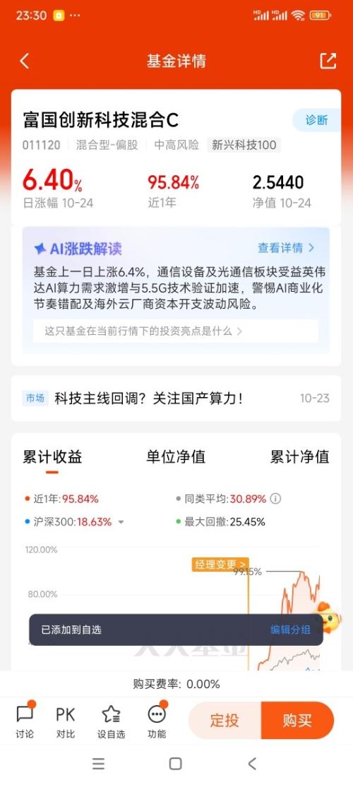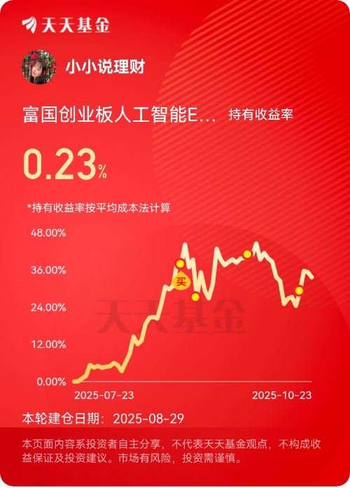 创业板人工智能又双叒起飞! 宝子们好呀,咱就是说,最近小小一直都在强调!短期会有方向的选择出来。虽然技术面不是万能的,但是当下就是——走修复是顺势。昨天大科技回调,今天就再度爆发,目前CPO含量较高的创业板人工智能再度大涨逾5%,小小周一就右侧加了$富国创业板人工智能ETF发起式联接C$,今晚又能吃大肉了~ 现在市场最缺的就是具备带动性的板块。只要主线板块出现,有了赚钱效应,自然就能够吸引场外资金...