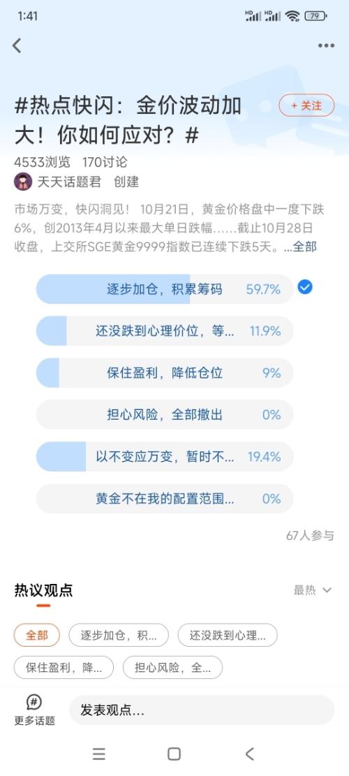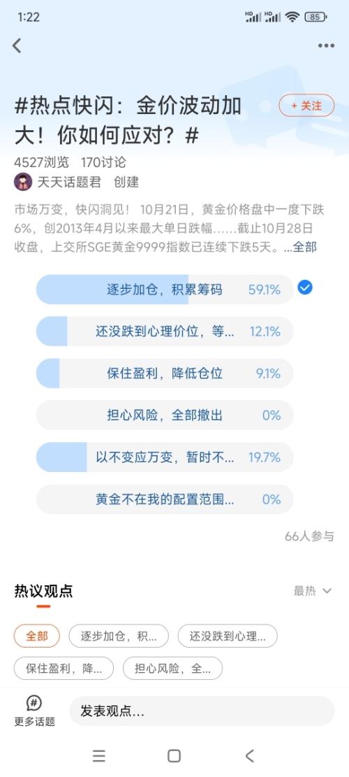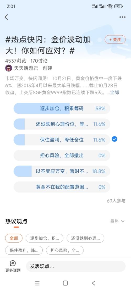 我在#热点快闪:金价波动加大!你如何应对?#选择了“逐步加仓,积累筹码”,说实话,我可不敢赌自己能精准踩中“最低点”,之前金价一路涨超60%的时候,就有不少人追着买,结果碰上中美关税缓和、俄乌局势传利好,市场避险情绪一降,直接被高位套牢了。这种上蹿下跳的行情里,一次性allin太像“赌大小”,与其担惊受怕,不如把钱拆成好几份,分批进场更踏实。 我的法子其实特简单,就是“底仓+定投+回调补”的组合拳...