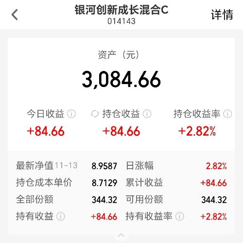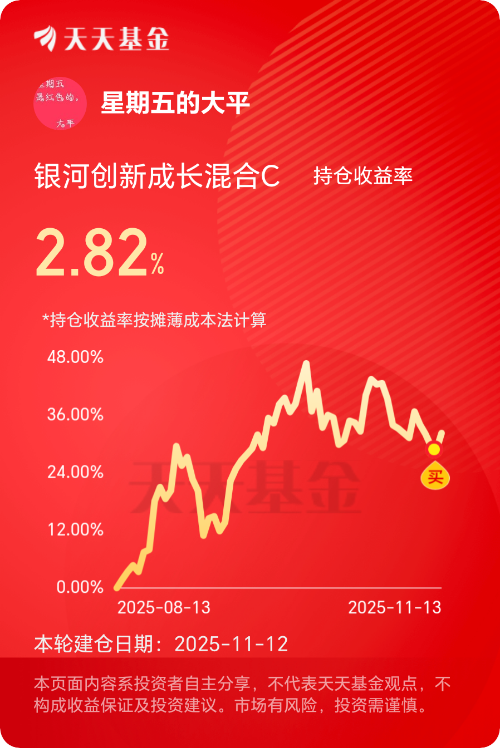 今天权益市场虽然不错但是涨的好的是电池新能源科技还有很多不给力的,不过$银河创新成长混合C$今天2.82%表现优秀混合基能打能抗我继续看好!