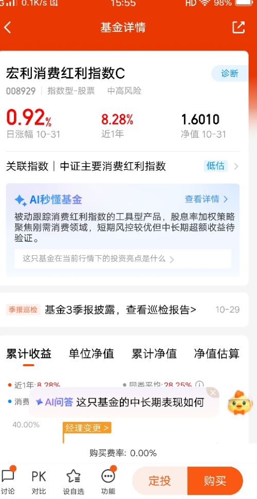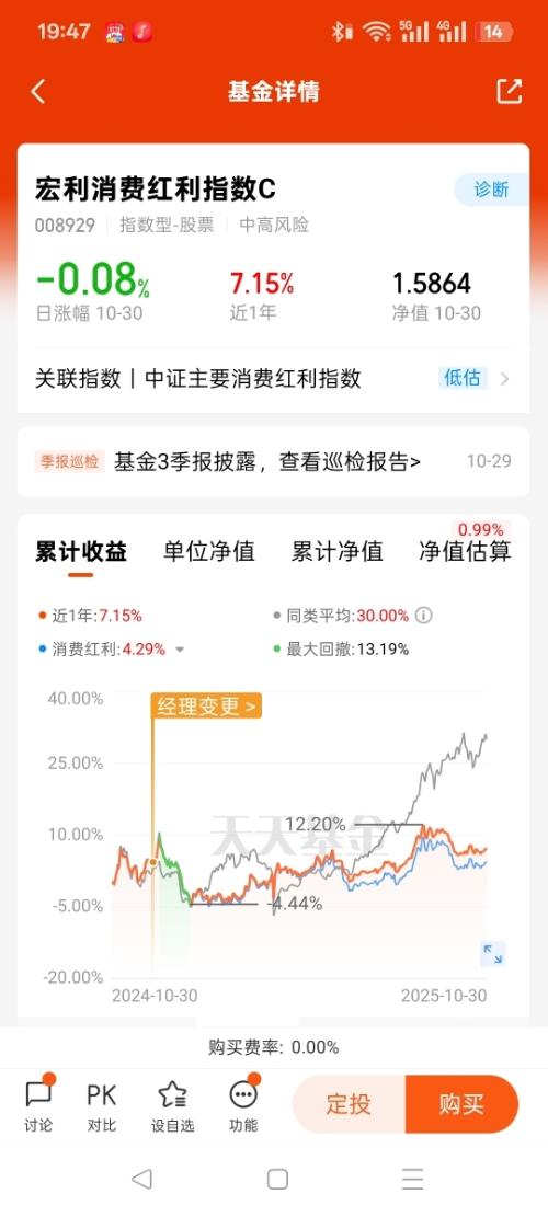 宏利消费红利指数A基金,真是一只奇葩的基金。近五年收益率12.6%,而跟踪的中证主要消费红利指数H30094近五年收益率大概是-12%左右。 你这逆天的成绩是怎么做到的啊