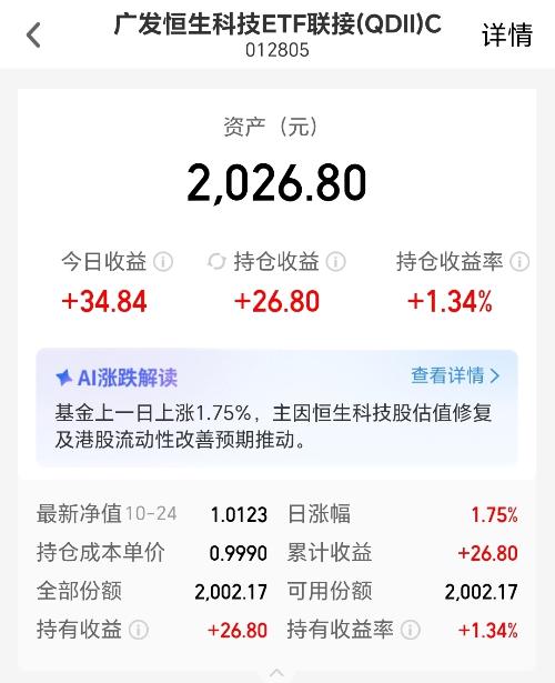 关税扰动或将有所缓和,市场投资情绪回暖,恒生科技最近也是如期拉升,我的$广发恒生科技ETF联接(QDII)C$连涨并且今日上涨1.75%,弹性妥妥的。而且降息预期下流动性改善或持续推动指数估值修复,未来走势仍可期!#晒收益# $博时恒生科技ETF发起式联接(QDII)C$$建信恒生科技指数发起(QDII)C$$诺安成长混合C$