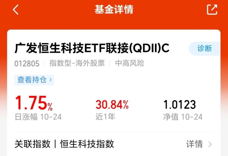今天赚钱效应还是非常不错的,上证指数收涨0.71%,沪深300指数涨1.18%,恒生科技涨1.82%,港股互联网涨1.05%,港股通科技涨1.78%。 我连续2次抄底的$广发恒生科技ETF联接(QDII)C$收涨1.75%,它紧密跟踪恒生科技指数,偏离率低,非常精准,我今晚收益也翻红,已经盈利1.34%了。 这个基金近1年涨超30.84%,还是很棒的! 恒生科技当前估值很低,后续还是值得期待的,我...