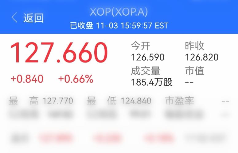 $华宝标普油气上游股票人民币A(OTCFUND|162411)$ 11月4日播报:11月3日晚,标普油气开采指数spsiop4924.360,+31.560,+0.65%。 11月3日晚,SPDR标普油气开采指数EFT(XOP.A)开盘126.590,收盘127.660,+0.840,+0.66%。 11月3日美元人民中间价7.0867,-0.02%,-0.0013。 10月31日华宝油气A162...