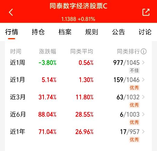 给大家揭秘一只科技牛基:同泰数字经济C!排名前百分之一的科技型基金,近半年收益率88.04%远超同类收益,算力投资尖兵聚焦算力、存储芯片、半导体、光模块cpo,深耕算力产业链,各阶段排名优秀,中科大毕业的基金经理有半导体背景,做科技得懂科技!$同泰数字经济股票C$ #4000点到底要不要止盈?#