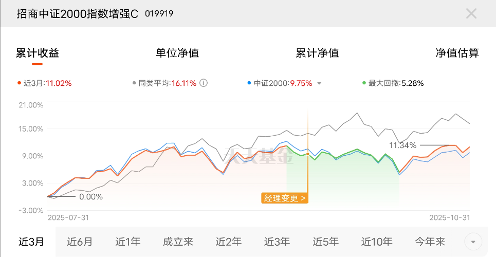 市场最近的节奏中,小微盘股特别活跃,大盘震荡时稳得住,反弹时发力。招商中证2000指数增强C近3个月涨11.02%,贴合小盘行情。