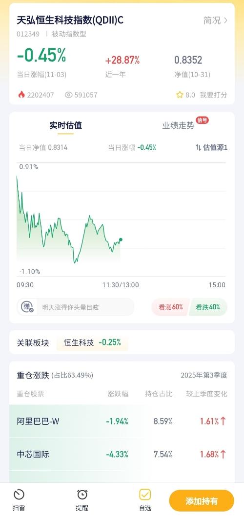 今天恒科指跟着大盘一起回调,我倒觉得是给之前没上车的机会了。广发恒生科技C近一年涨27.42%,我继续定投,美联储降息预期还在,科技板块的基本面和估值优势也没变,今天在补2000$广发恒生科技ETF联接(QDII)C$
