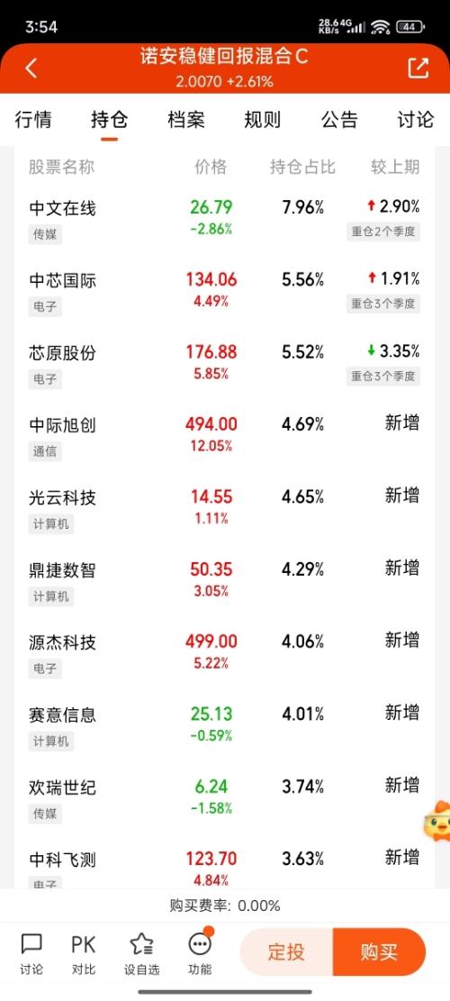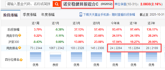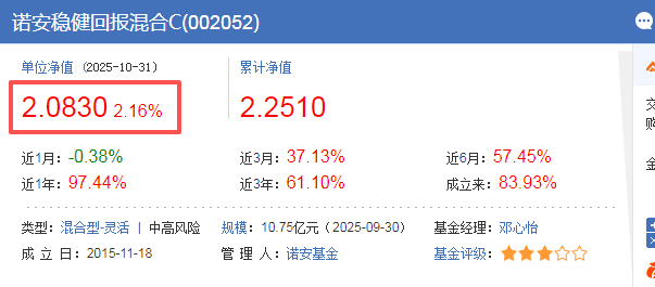 #天天基金调研团#2025年10月31日,创业板大跌2.31%,绝大部分科技成长风格的基金,净值都是下跌的,我持仓的某基金,当天跌了6.11%。而上面展示的这只基金,诺安稳健回报混合(002052)却涨了2.16%,这波操作真的堪称鬼斧神工!如果你看一下最新公布的2025年9月30日的持仓股,就会明白我为何如此形容。前5大重仓股均是大跌的,净值怎么可能还涨2.16%呢?唯一可以解释的原因,基金经理...